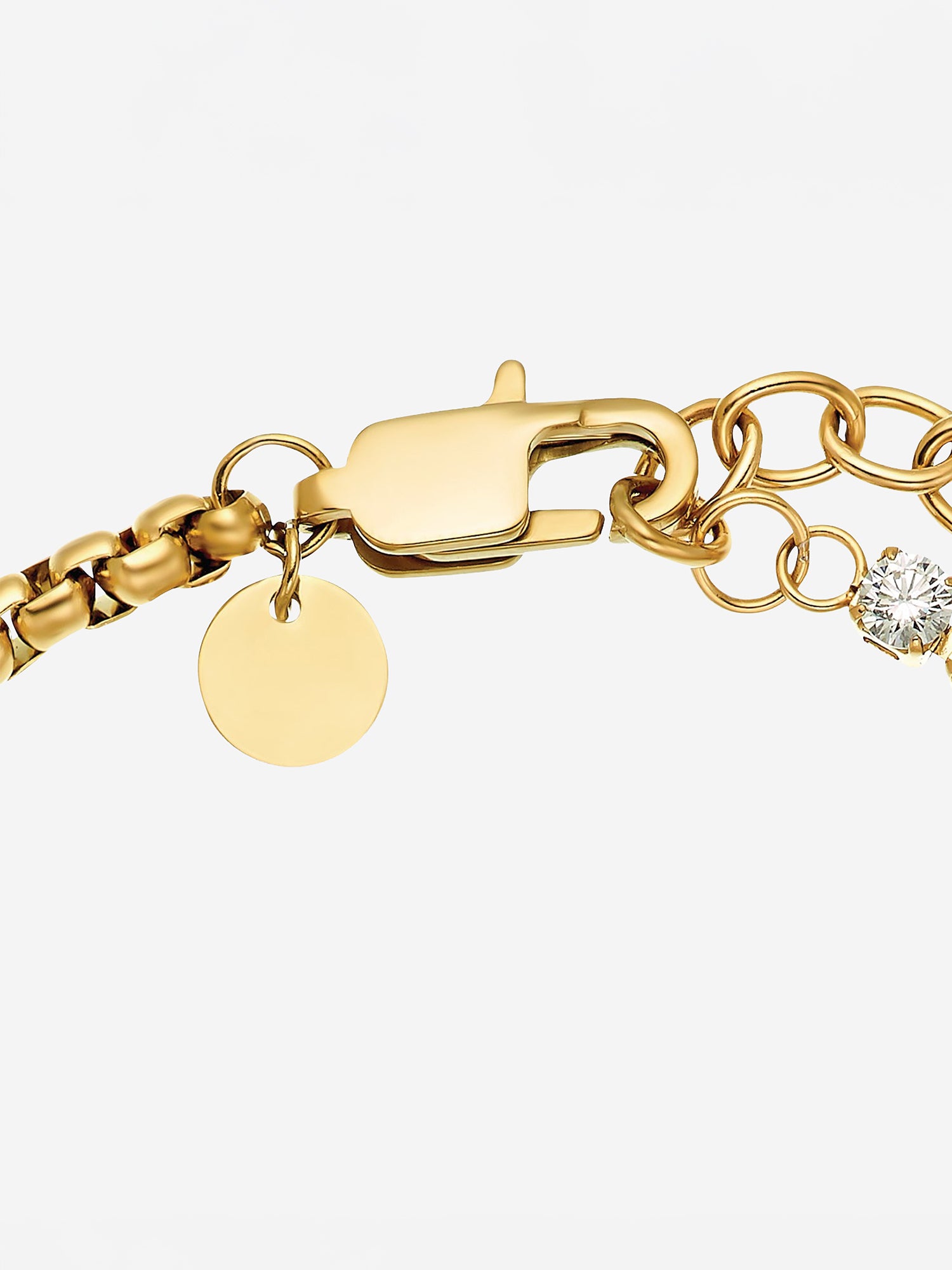 Die Kombination aus glänzendem Goldfinish und funkelnden Steinen macht das Armband zum perfekten Statement-Piece. Minimalistisch genug für den Alltag, aufregend genug für besondere Momente, solo oder im Mix & Match mit anderen Armbändern.