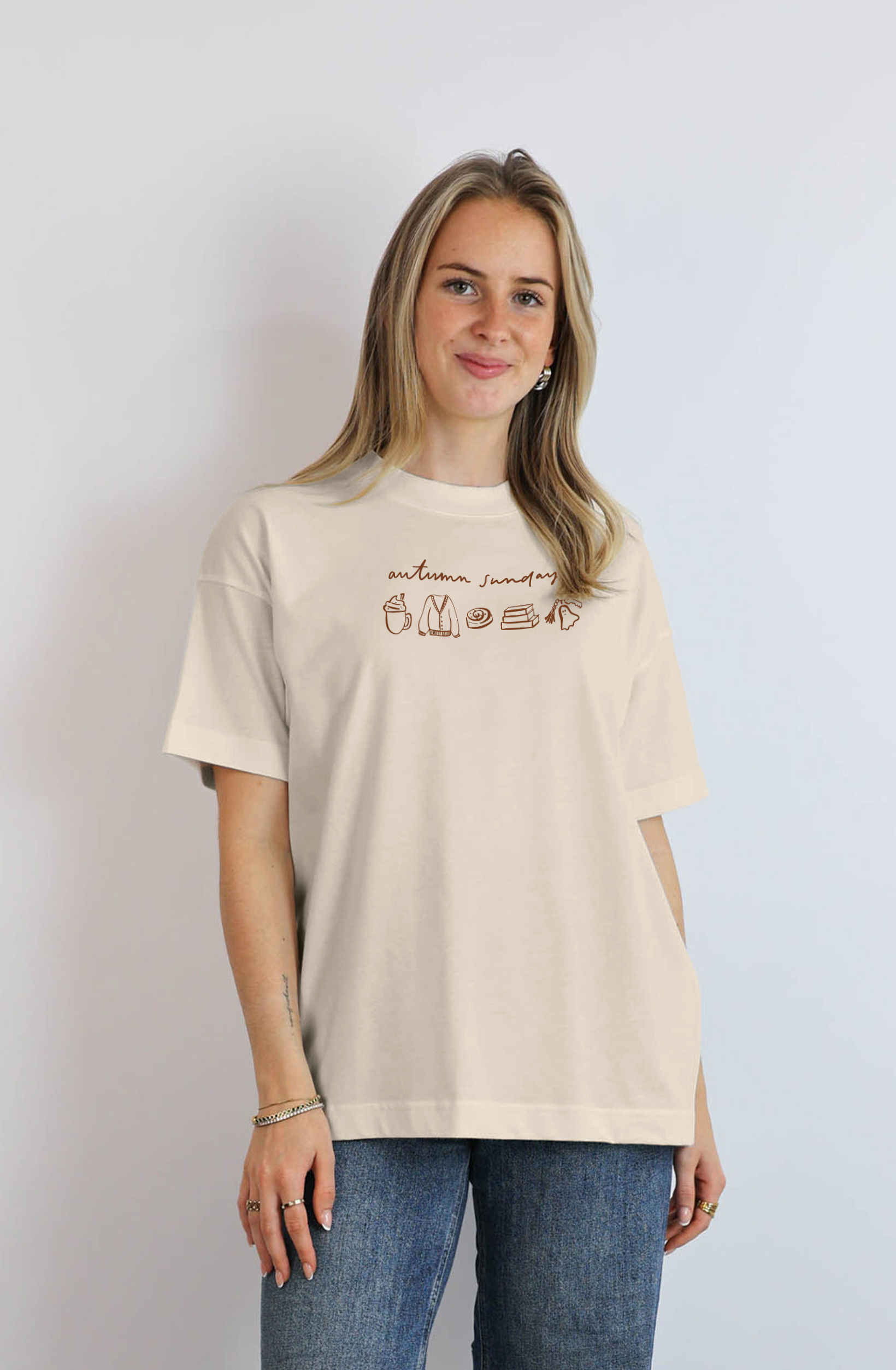 Unser "Autumn Sundays" Shirt ist in den Farben Beige und Off White erhältlich. Es hat eine lässige Passform mit längeren Ärmeln, sitzt insgesamt eher oversized und fällt dadurch größer aus. In deiner normalen Größe sitzt das Shirt oversized – bitte beachte die Größentabelle. Es besteht aus 100% Baumwolle (Bio-Baumwolle) und wurde unter fairen und nachhaltigen Bedingungen hergestellt. Unser Shirt ist auf der Vorderseite bedruckt.