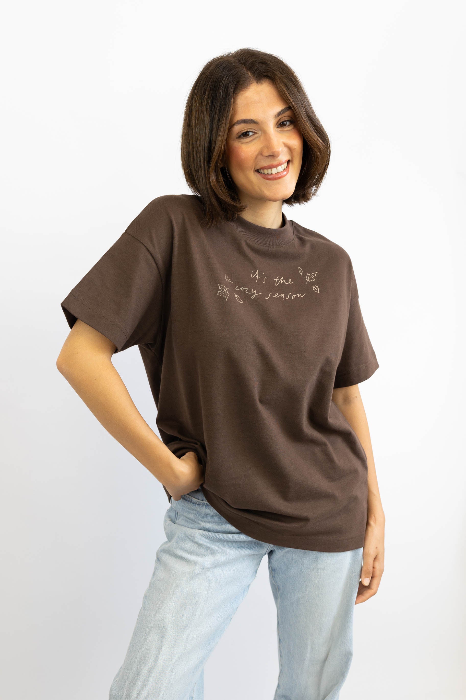 Unser "Cozy Season" Shirt ist in den Farben Midnight Blue, Cranberry, Espresso, Pine Green und Schwarz erhältlich – passend zu unserer Fall/Winter Kollektion 2026. Es hat eine lässige Passform mit längeren Ärmeln, sitzt insgesamt eher oversized und fällt dadurch größer aus. In deiner normalen Größe sitzt das Shirt oversized – bitte beachte die Größentabelle. Es besteht aus 100 % Baumwolle (Bio-Baumwolle) und wurde unter fairen und nachhaltigen Bedingungen hergestellt. Unser Shirt ist auf der Vorderseite bedruckt.